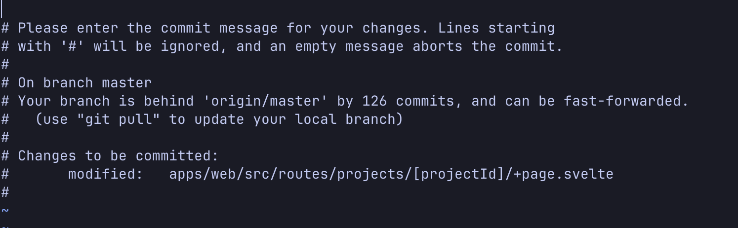 Здесь мы видим только список изменившихся файлов. Если установить commit.verbose в значение true, то сюда будет записан весь вывод diff, и вы сможете сверяться с ним, когда будете писать ваше сообщение.
