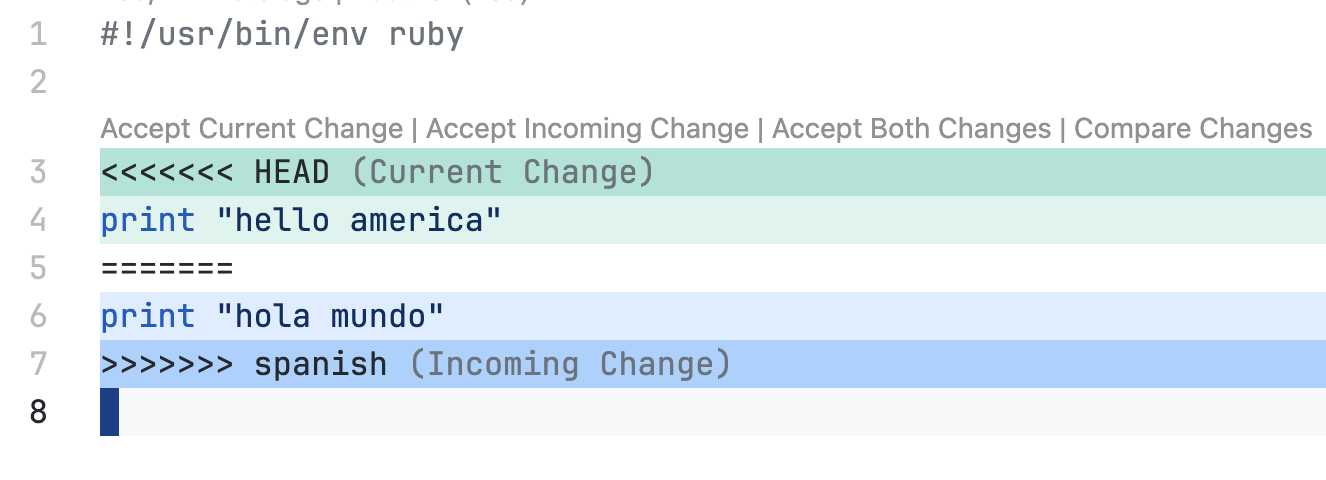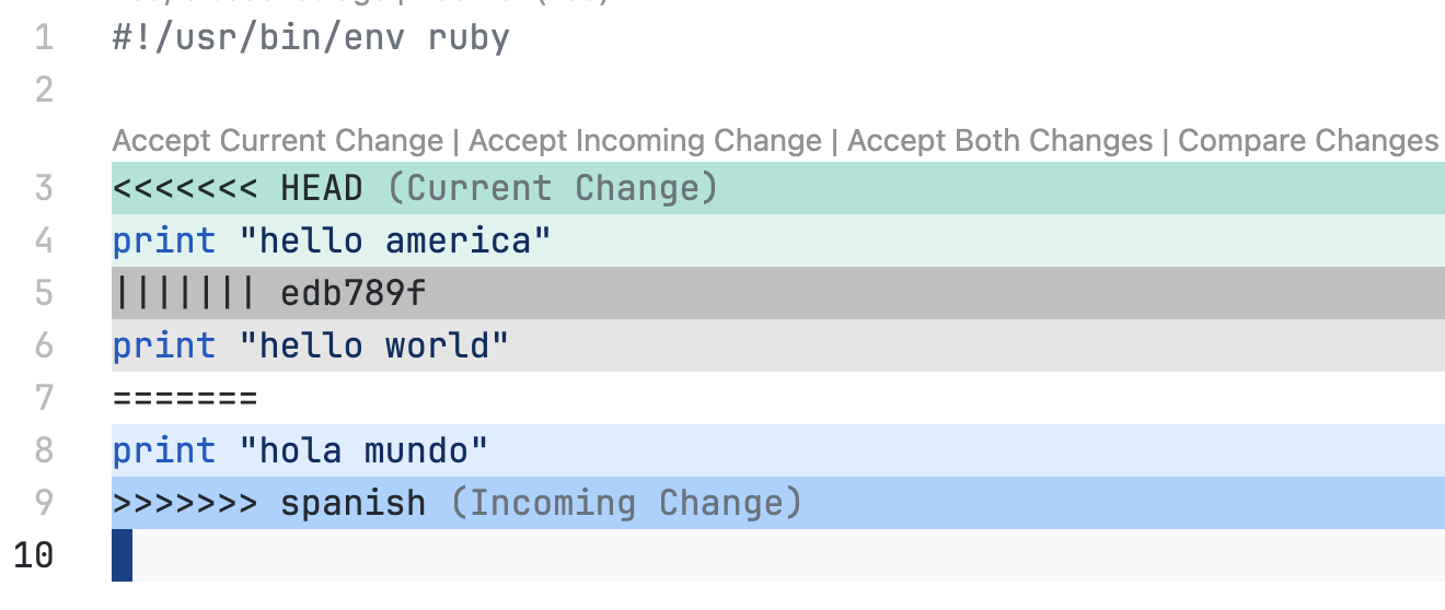 В сущности, кроме секций <<<<<< и >>>>>>, в которых вы видите, как вы изменили блок, и как его изменил кто-то другой, здесь также добавляется блок |||||||, демонстрирующий, как выглядела ветка до вышеупомянутых изменений.