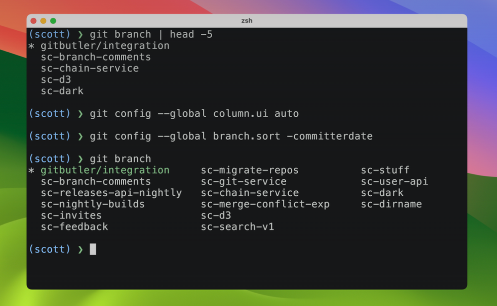 Есть две настройки, помогающие улучшить эту ситуацию: branch.sort и column.ui. Первая из них сортирует список не по алфавиту, а по свежести дат коммитов (поэтому самые интересные коммиты должны находиться в верхней части списка). Вторая выстраивает имена веток в формате столбцов так, чтобы на экране было видно больше такой информации.