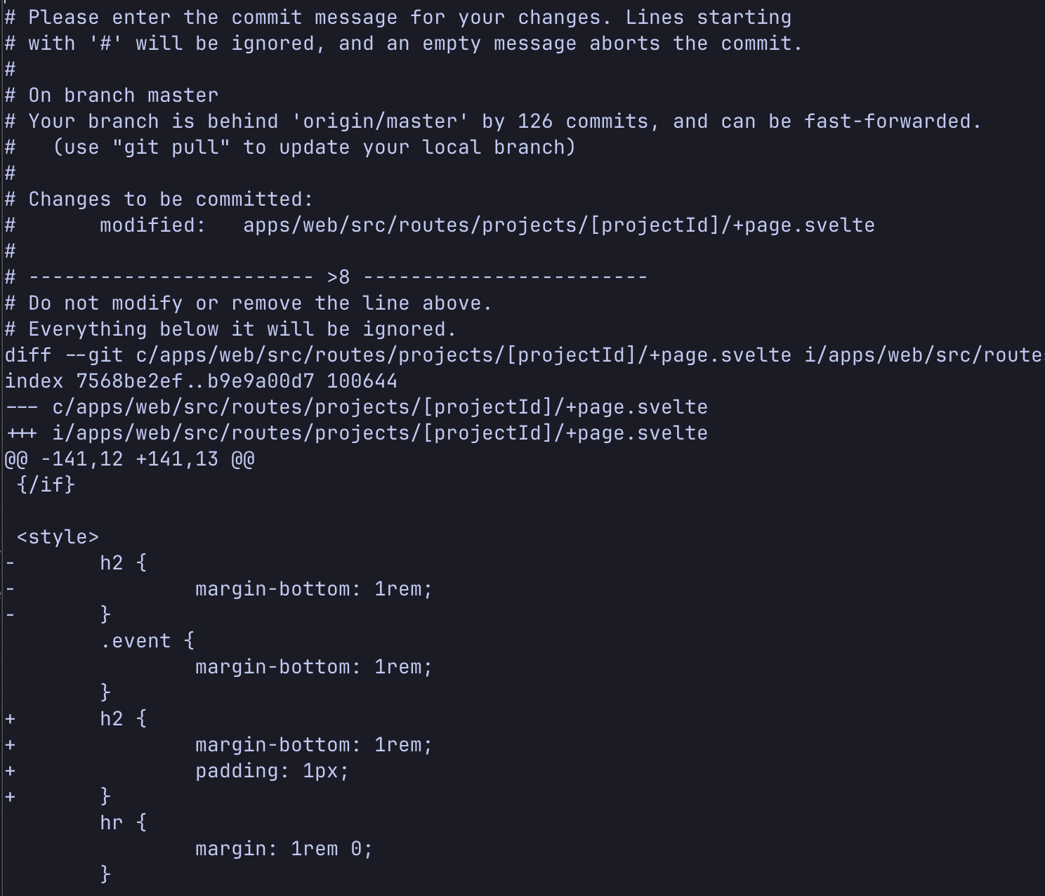 Всё это будет удалено из сообщения о коммите (всё, что расположено ниже этой забавной «линии разреза» -- >8 -- ), но зато вы получите гораздо более подробный контекст, когда будете писать сообщение.
