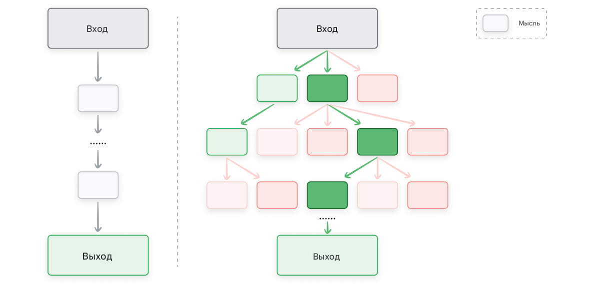 Дерево рассуждений (Tree of Thoughts) расширяет концепцию цепочки рассуждений, позволяя БЯМ исследовать несколько параллельных путей рассуждения одновременно.